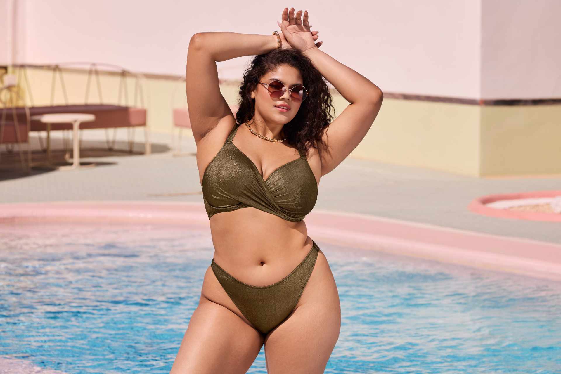 protagonista della stagione con un design ispirato alle onde illuminate dalla luna e impreziosito da un morbido filato metallizzato color oro che riflette la luce con eleganza, realizzato in tessuto elasticizzato scintillante per un look glamour e sofisticato, caratterizzato da un raffinato dettaglio a portafoglio che valorizza il décolleté,