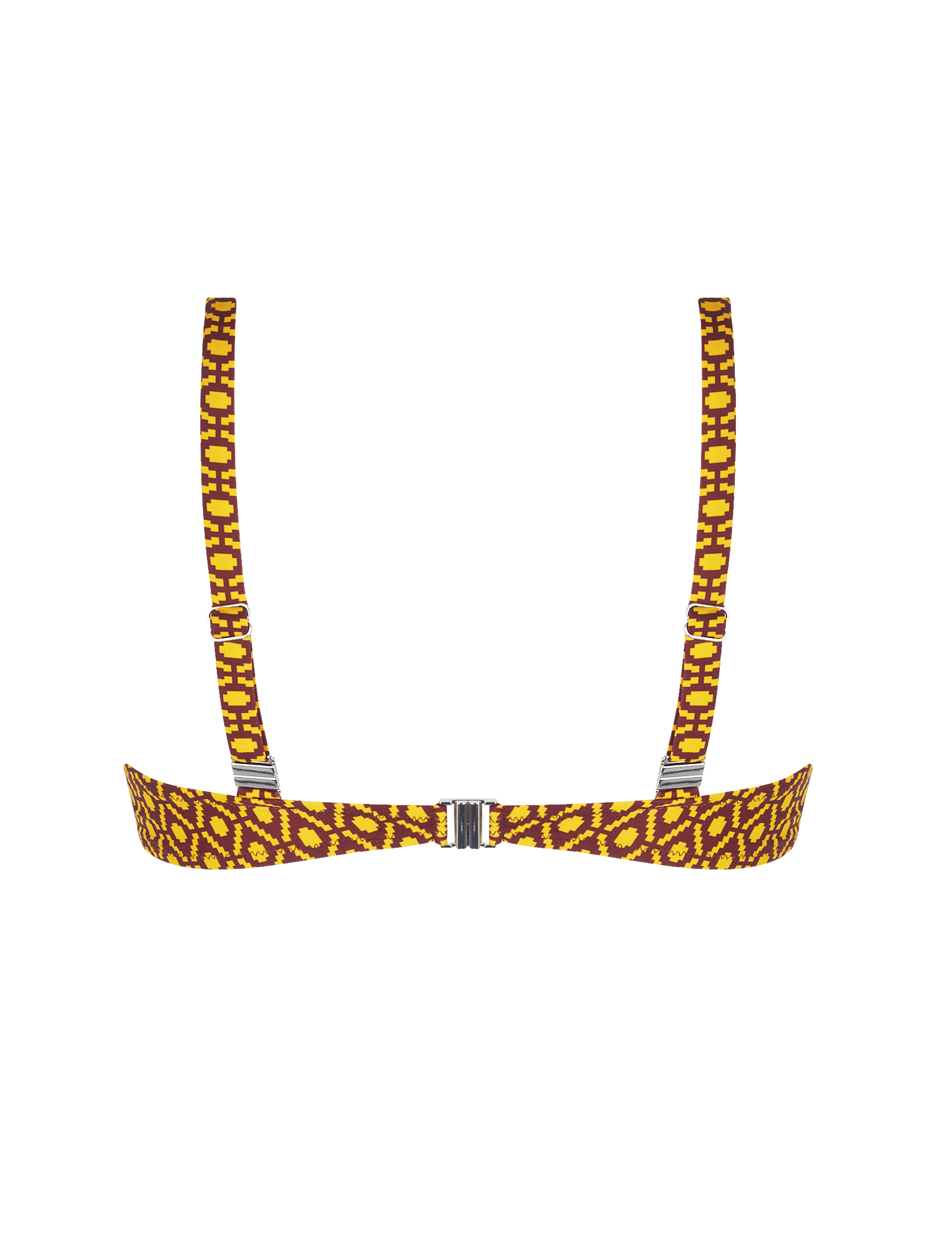 Reggiseno bikini a triangolo con ferretto in tessuto stampato, morbido e confortevole. Modello con scollatura profonda che valorizza il décolleté e coppe a triangolo per una vestibilità naturale. Spalline regolabili con anelli alla base che permettono di indossarlo in diversi modi: all’americana, con spalline dritte o incrociate sulla schiena, ideale per un look mare femminile e versatile.
