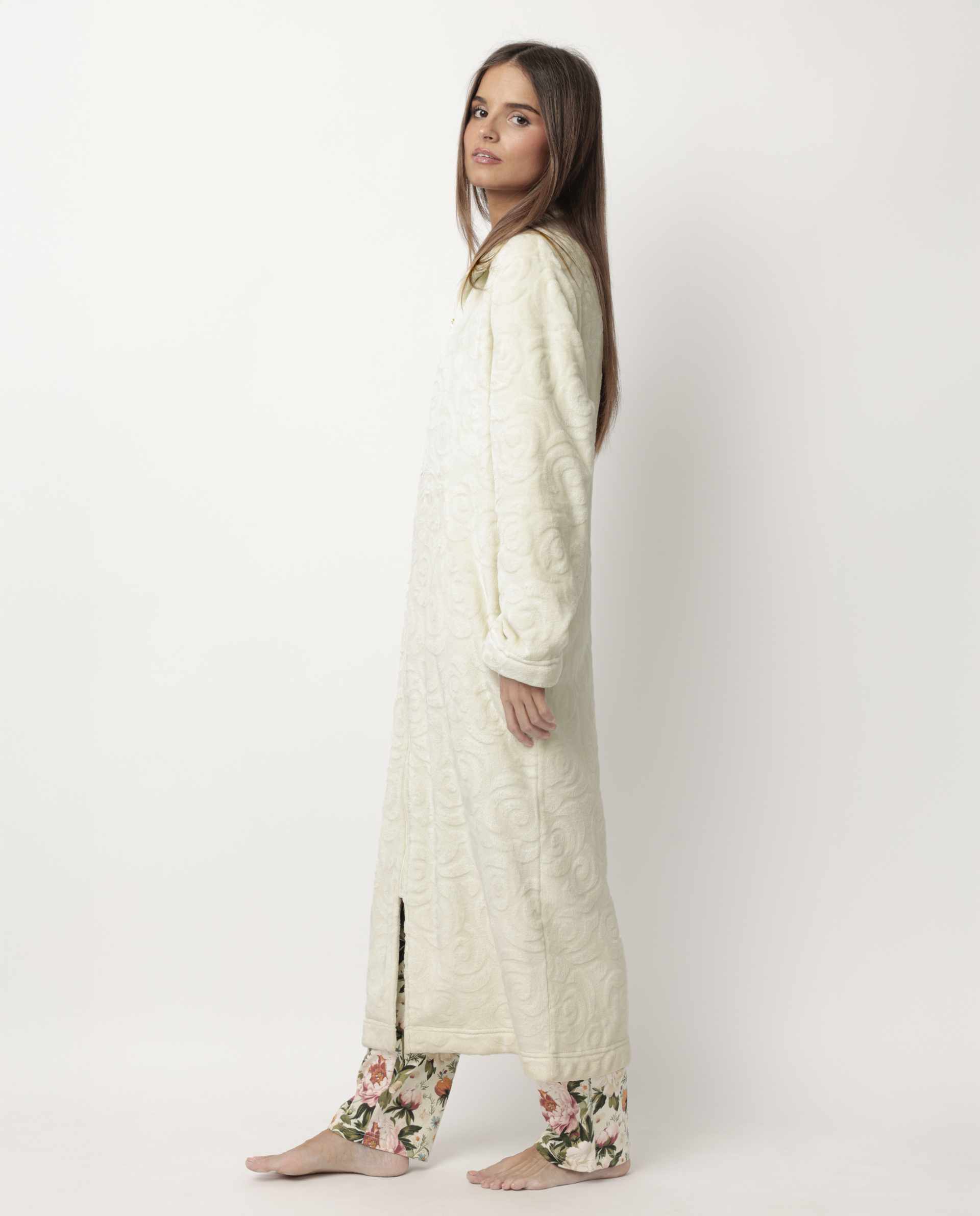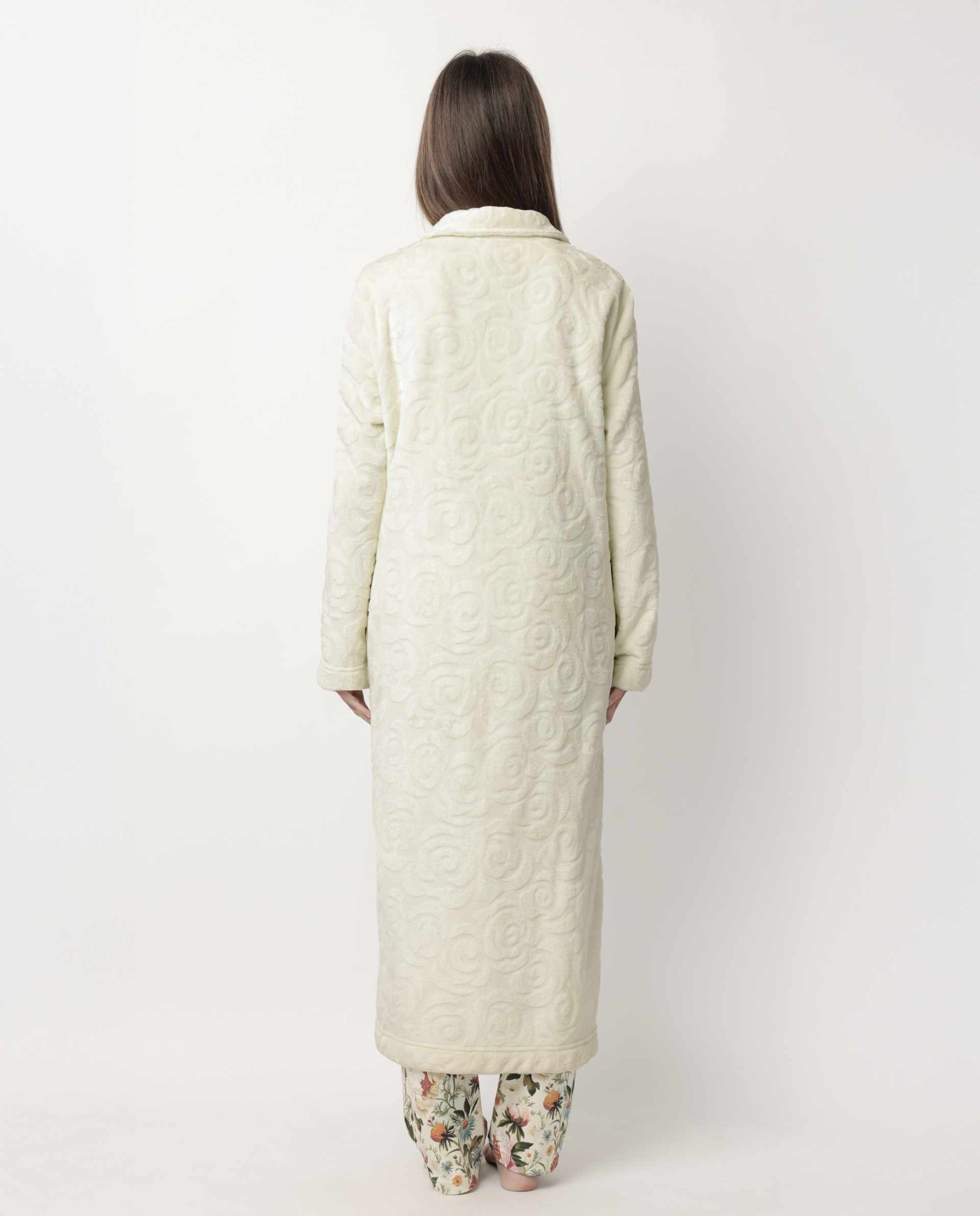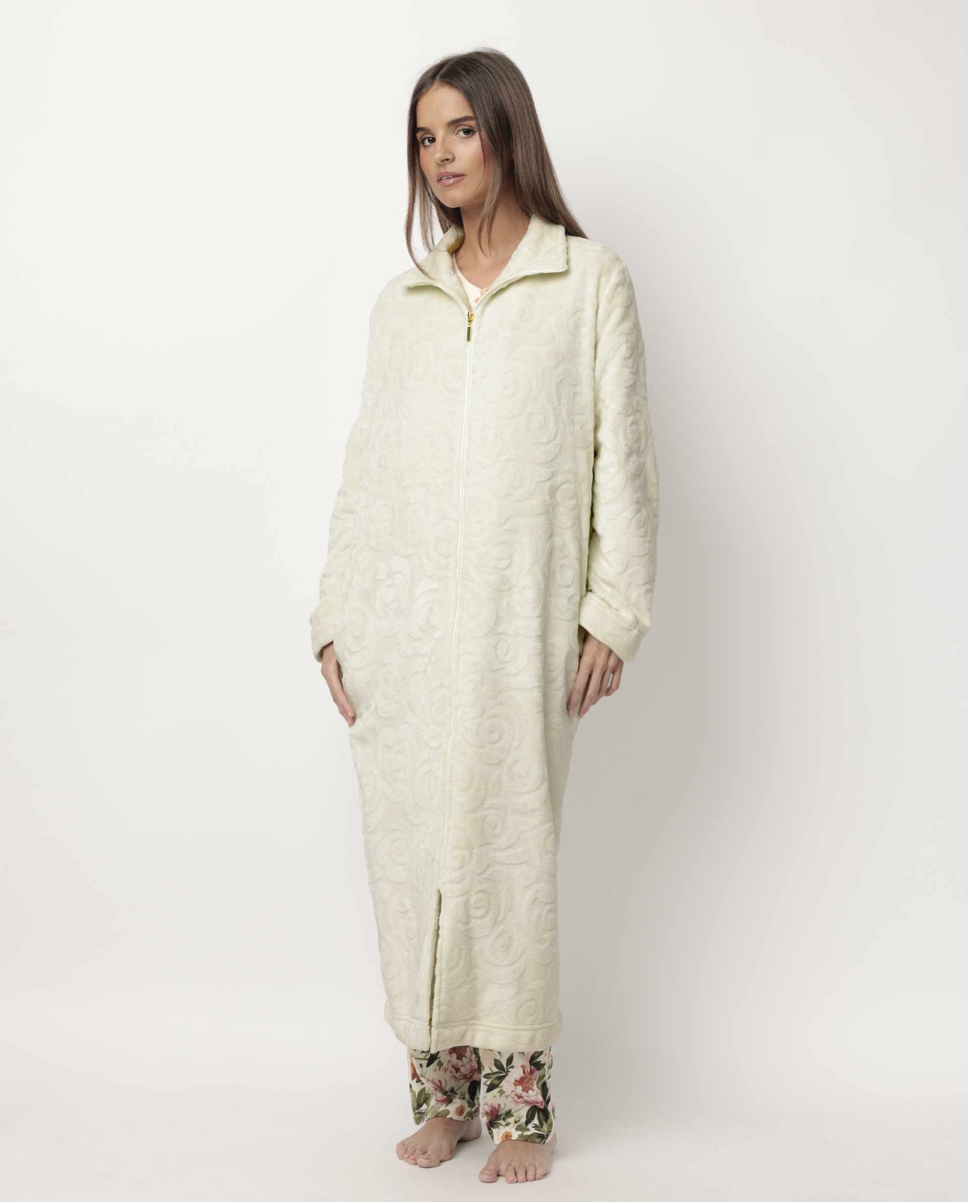 Vestaglia lunga da donna in tessuto coral a lavorazione jacquard calda e avvolgente con zip Realizzata in morbido coral ad alta densità, questa vestaglia offre un comfort eccezionale e un calore ideale per affrontare le giornate più fredde. Il design presenta tasche frontali pratiche e un originale per un look distintivo e moderno.