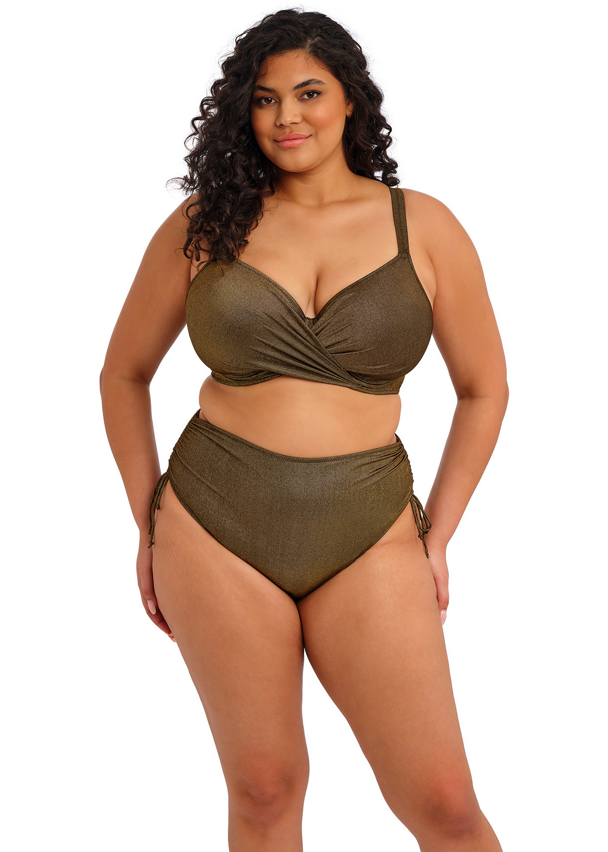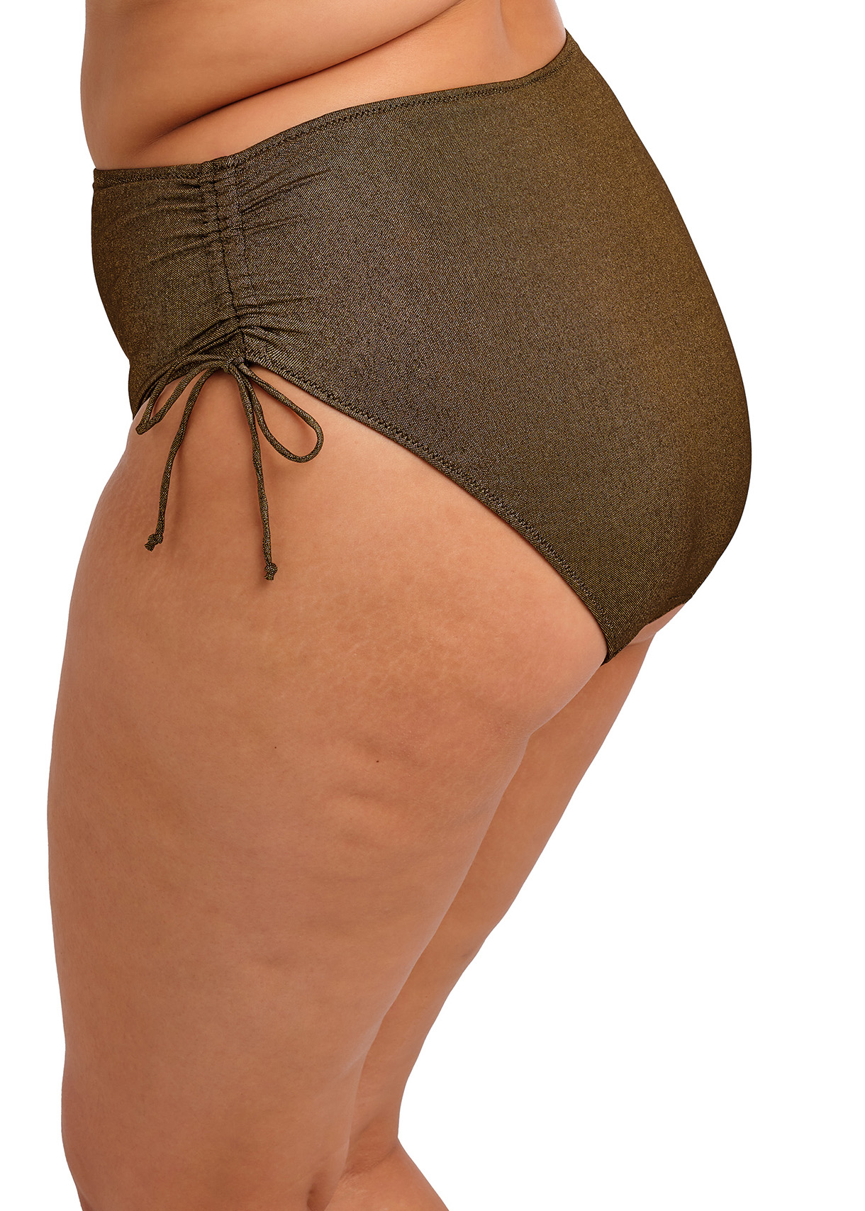 Slip bikini donna a vita alta della collezione Sunset Shimmer, ispirato alle onde illuminate dalla luna e impreziosito da un morbido filato metallizzato color oro che cattura la luce con eleganza, realizzato in tessuto elasticizzato scintillante per un look glamour e confortevole, dotato di regolazione laterale che permette di scegliere il livello di copertura desiderato, con parte anteriore foderata per garantire maggiore discrezione e comfort durante l’utilizzo.tessuto :