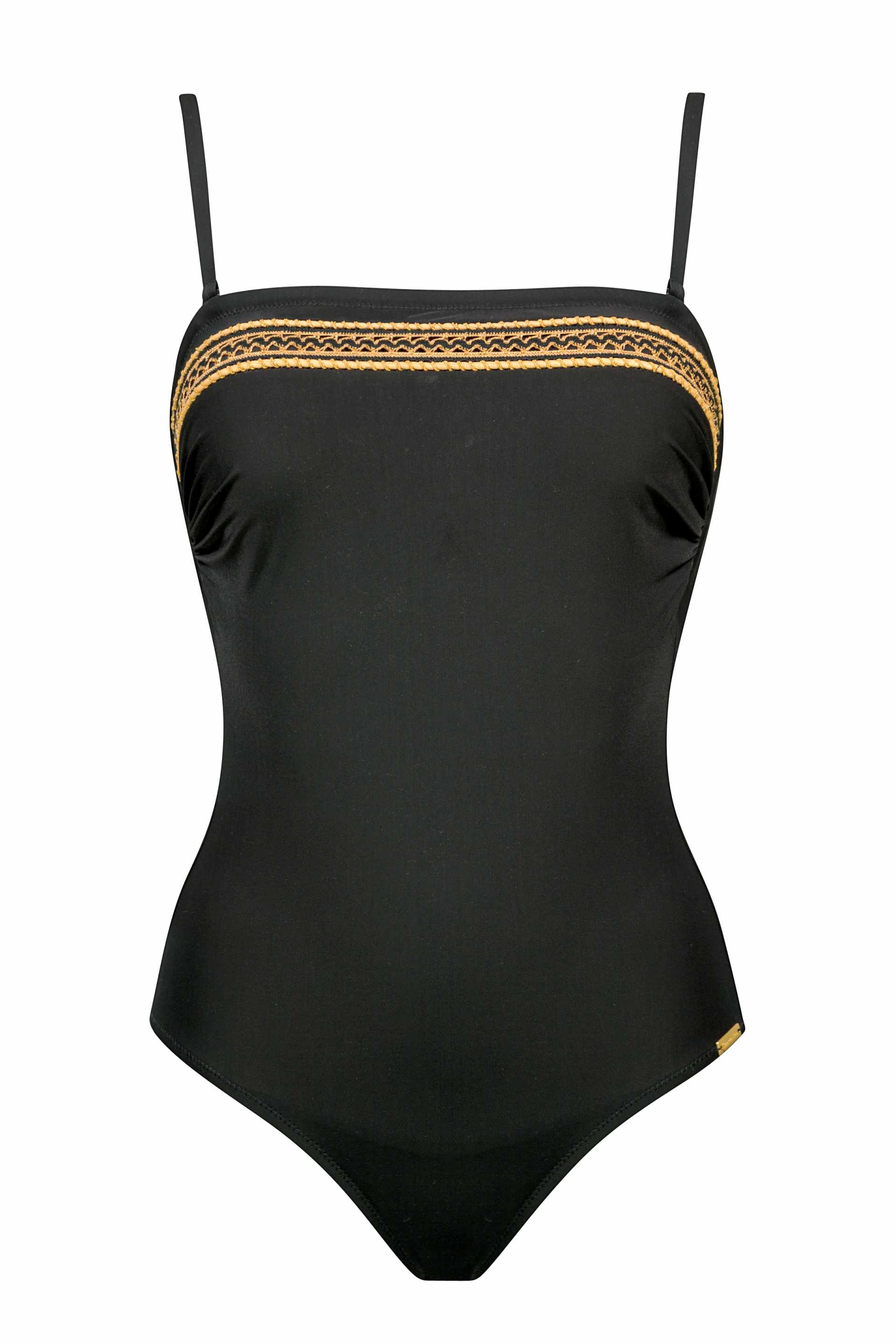 Costume da bagno intero a fascia da donna elegante e moderno, con reggiseno a leggera coppetta per sostegno naturale e comfort, design senza spalline ideale per un’abbronzatura uniforme senza segni, impreziosito da raffinato ricamo dorato di tendenza, vestibilità avvolgente che valorizza la silhouette, realizzato in tessuto elasticizzato resistente a cloro e salsedine, rapido ad asciugarsi e perfetto per mare e piscina
