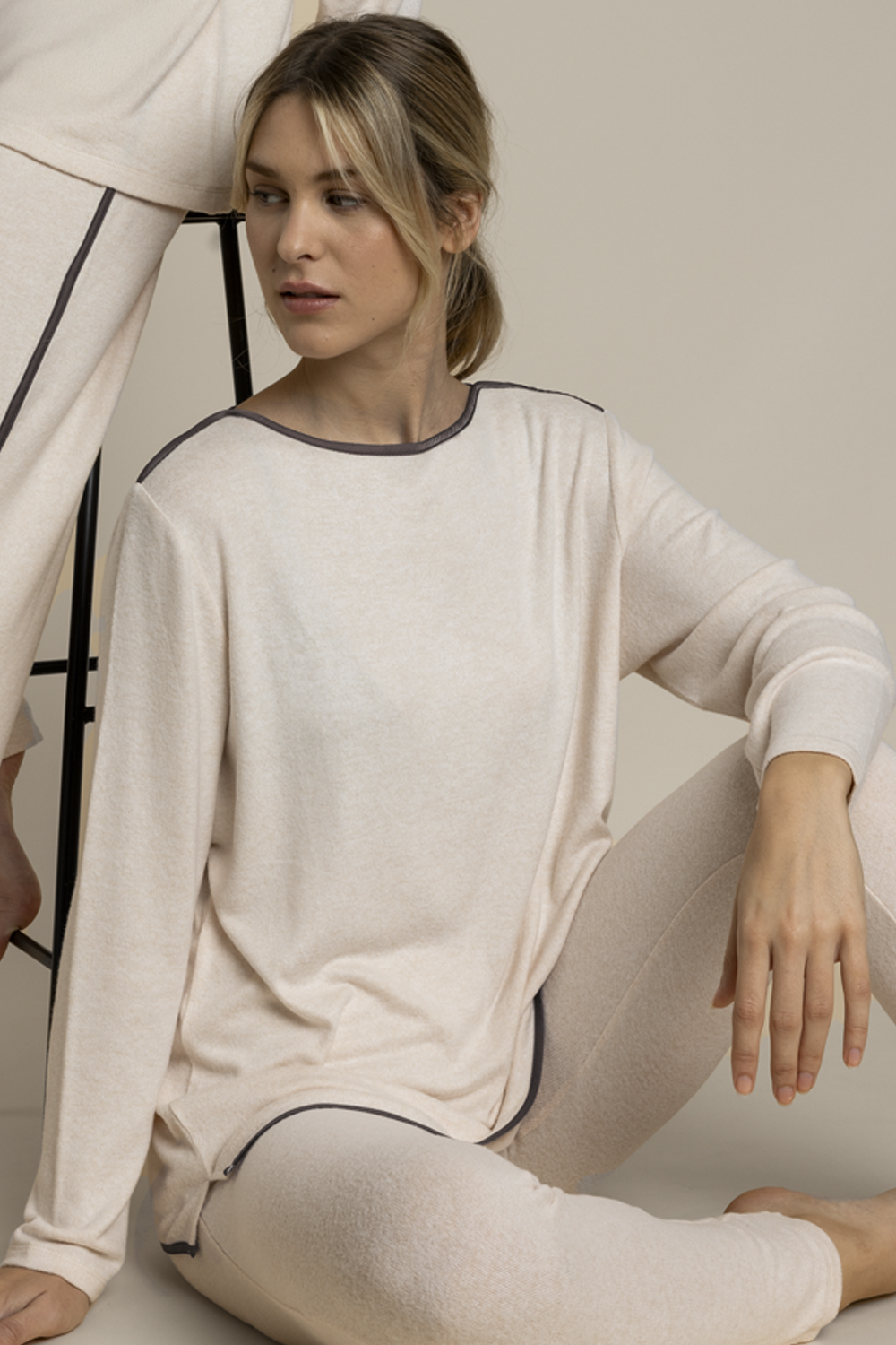 maglia colore avorio a maniche lunghe con eleganti dettagli in raso.